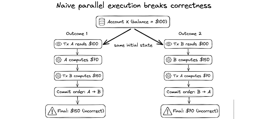 If two transactions can read the same initial state, but one transaction changes the state while the other transaction is still processing, the old state–and any results based on it–becomes invalid. In the first parallel execution scenario, Transaction A and Transaction B both read $100 as the initial balance, but Transaction A updated the balance to $70. Transaction B executed the operation with the old balance ($100), which caused it to update the account balance with the wrong result ($150).
