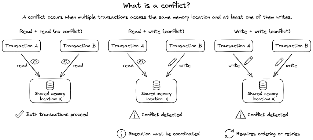 Reads don’t inherently conflict, except when two transactions reading an account expect to write a new state (read-read operations don’t conflict, but read-write operations do). Read-read operations can, however, conflict when the execution model requires exclusive access for reads (i.e., treating reads and writes equally). Permitting shared reads unlocks opportunities for higher concurrency, particularly for optimistic systems that maximize parallelism. Forcing reads to behave like writes that require exclusive access to an account means simple account checks (like Transaction C from the earlier example) are delayed unnecessarily, and concurrency is reduced.