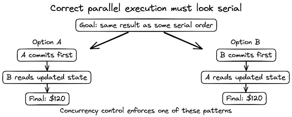 You’ll notice that the result of executing the transactions now looks like they were executed sequentially. In fact, the transactions are executed sequentially in this example. This is where concurrency control really enters the picture–what we did in this example (enforcing sequential access to state for both reads and writes) is one way of managing conflicts that could impact the correctness of parallel execution. We’ll explore two approaches to concurrency control in the next section.