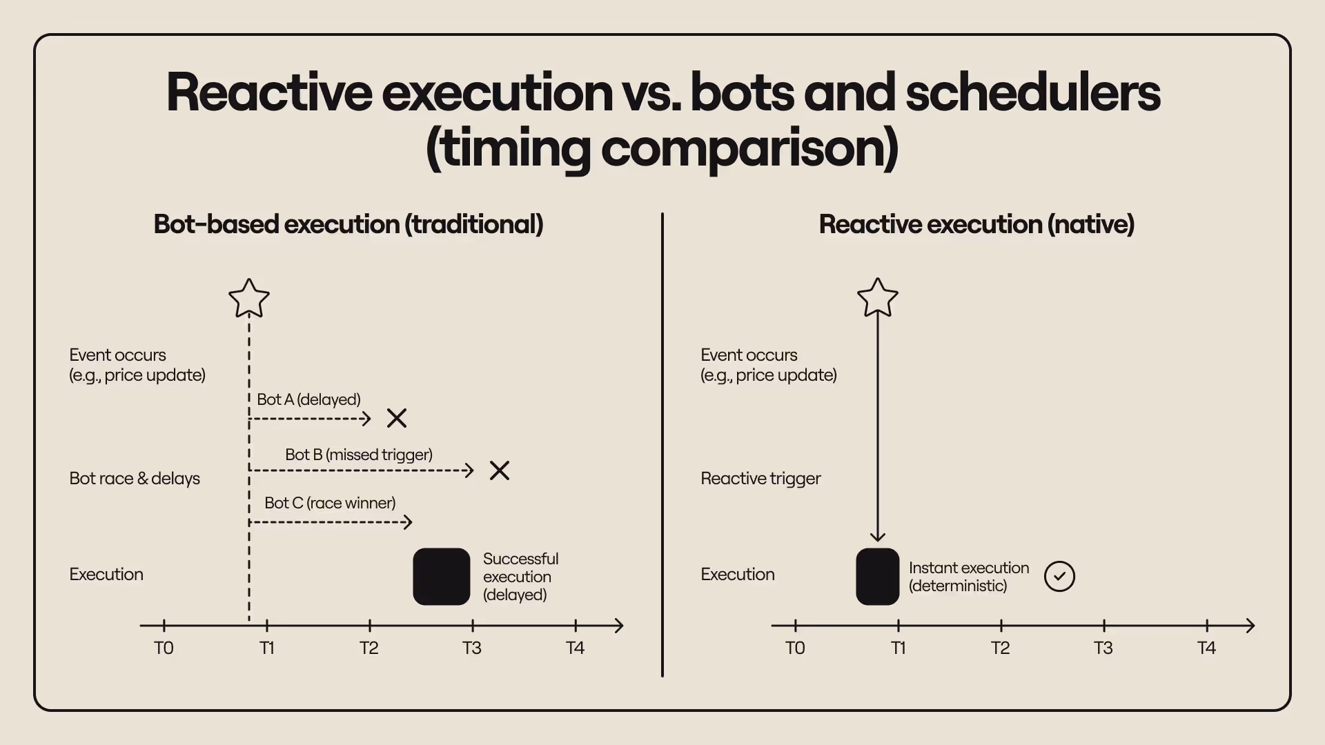 - Reactive execution broadens the design space for onchain systems by enabling autonomous operations and self-maintaining applications. Perps and lending markets, RWAs, prediction engines, subscription platforms, and other protocols can operate automatically and asynchronously without bots, cron jobs, or keeper networks. Applications gain a direct way to react to onchain and real-world signals without relying on fragmented middleware.