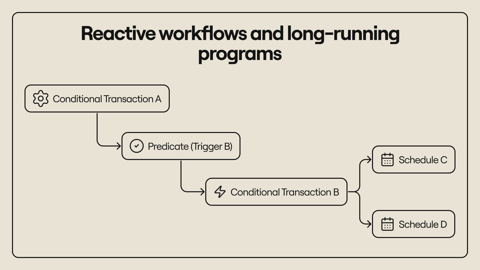 A workflow can suspend after its first step, store a predicate that will awaken it when an oracle updates, and schedule another conditional step that will run after a delay. It can also wait for synchronous or asynchronous conditions and resume execution only when the necessary signals change. In this way, workflows can span long time periods without relying on any external system to progress them.