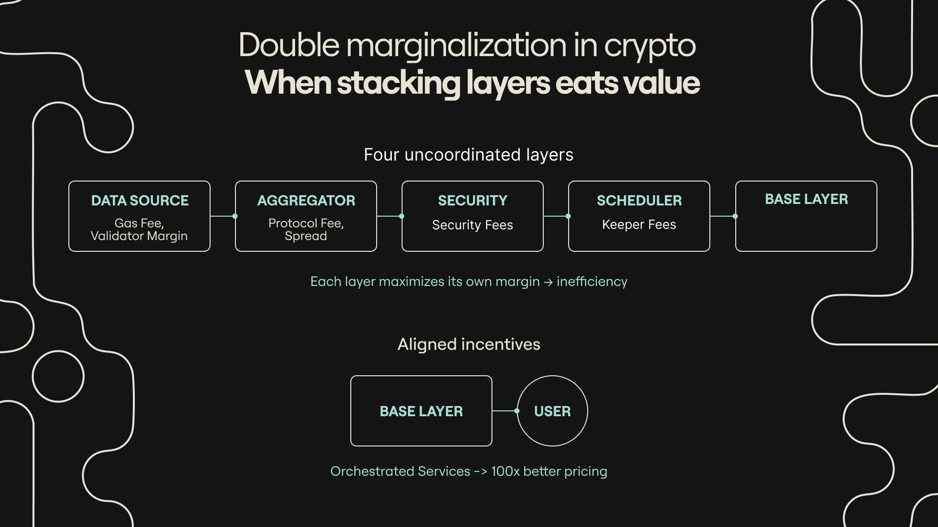 A similar dynamic plays out in crypto. Consumer-facing applications must contend with both base-layer blockchains and middleware protocols charging independently for services–each one intent on maximizing revenue without any consideration for user welfare. The costs accumulate quickly, forcing applications to raise user fees to remain solvent. Aggregate demand falls, and everyone loses: users pay more, while base layers and middleware providers collect less over time, since their revenues ultimately depend on the very applications and users their pricing drives away.