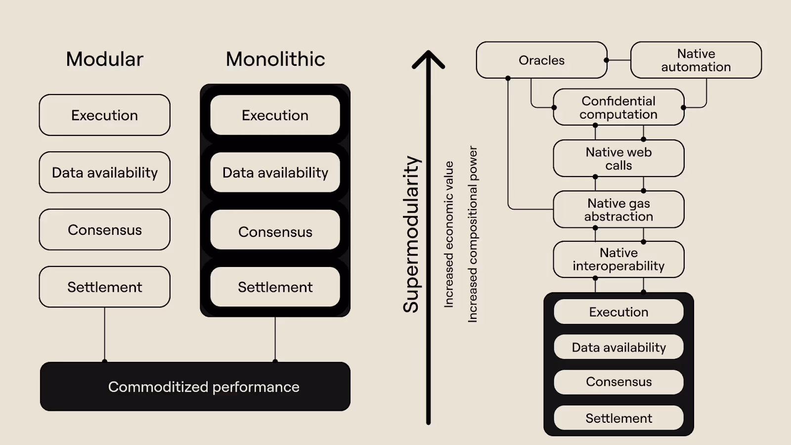 Supermodularity does away with the old framing and provides a more straightforward, more rational objective to guide integration when designing blockchains. The aim is to integrate as many functions that reinforce each other, and create emergent capabilities through integration, and externalize everything else. All of this is done to find points of integration that maximize chain utility, system welfare, net economic value, and efficiency–properties that determine a chain’s adoption in a world where everything else (performance, scale, and basic composability) is a commodity.