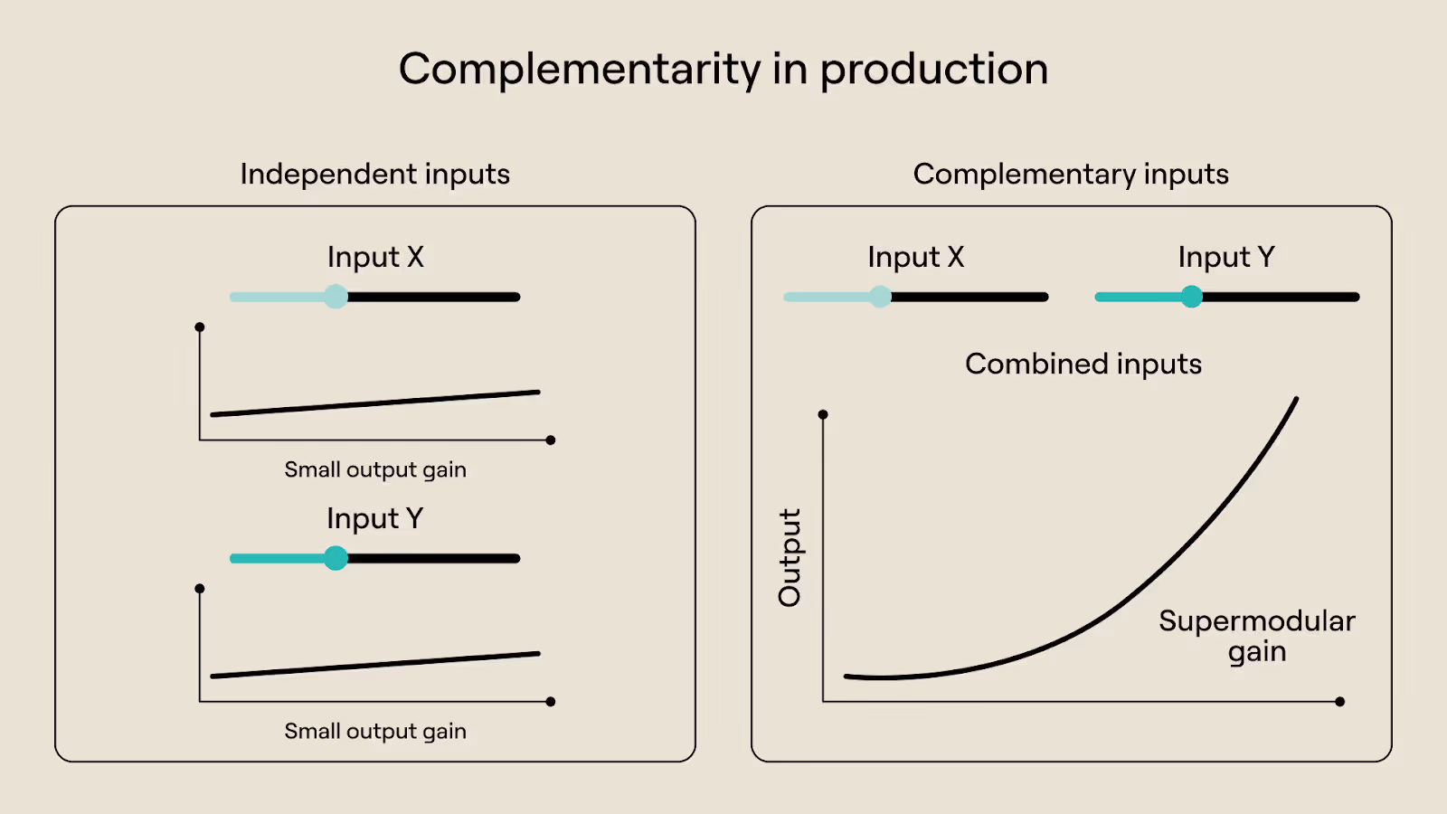 These two mathematical concepts point to distinct yet related requirements for supermodular designs. The first is complementarity in production: two components are supermodular when they reinforce each other in production. Increasing component A should raise the marginal value of increasing component B, and increasing component B should raise the marginal value of increasing component A. Put differently, improving one component should increase the return on improving another component in the system.