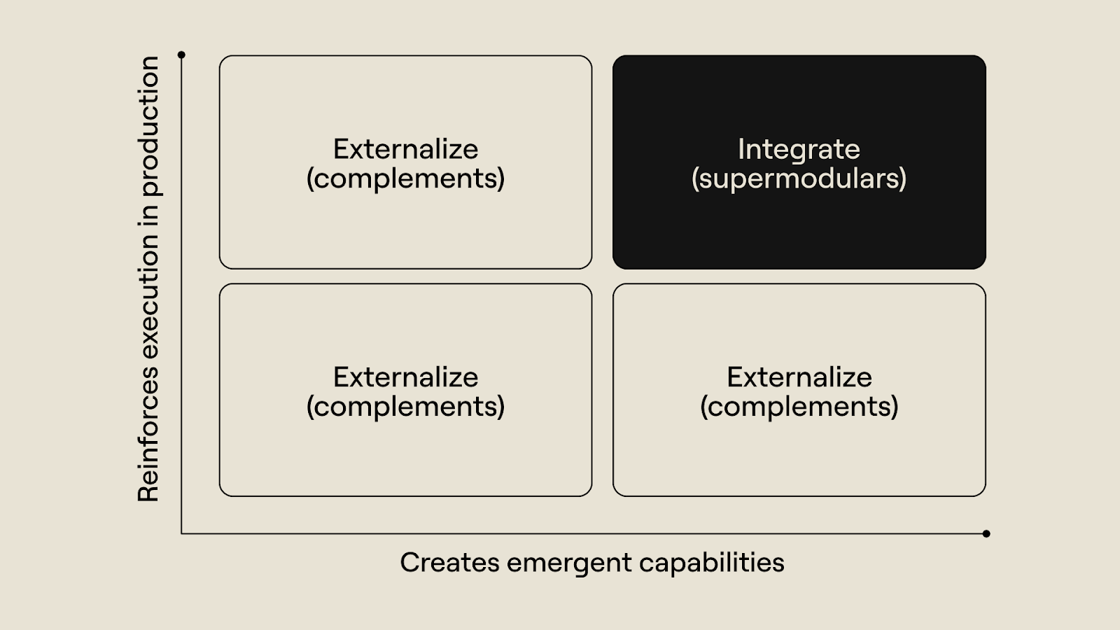 Supermodularity allows us to reason about integration from an economic perspective: we integrate components that reinforce each other in production and commodify everything else. Components that pass the supermodularity test are integrated into the base layer (and composed with execution); components that fail are treated as commodities, meaning they are acquired at competitive prices from external providers.
