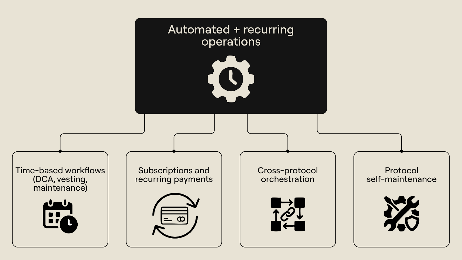 - Simple time-based workflows: Recurring DCA trades, gradual vesting unlocks, and protocol maintenance operations