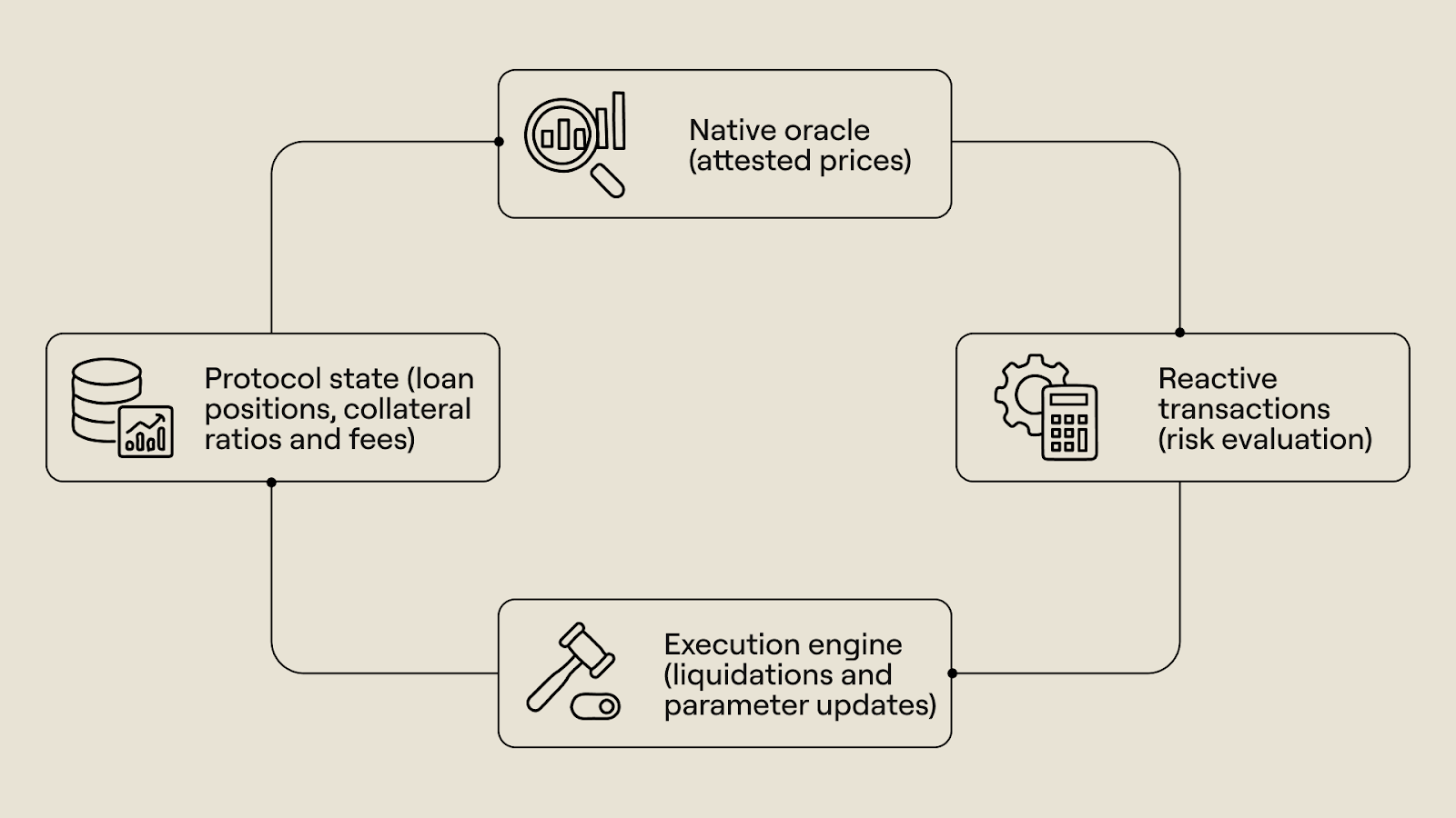 For example: a lending market that continuously monitors both market conditions, protocol activity, and onchain events and dynamically adjusts risk parameters to maintain desired invariants. It can pull attested price data from the native oracle at defined intervals, monitor at-risk loan positions, dynamically update fees and collateral requirements to control lending and borrowing volumes, and even trigger circuit breaker logic under certain conditions.