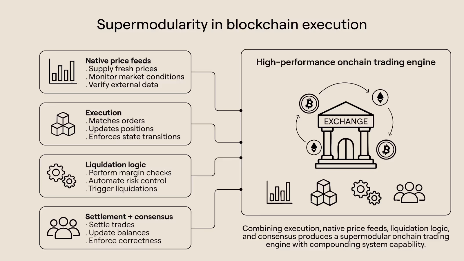We can observe similar dynamics in blockchain environments when strategically complementary components (components that reinforce each other in production) are integrated. When integration follows this pattern, blockchains unlock emergent properties that make onchain execution more useful, valuable, and efficient. Hyperliquid is a great example: they started as a trading app and then migrated to a chain that integrated price feeds and risk-management primitives with execution. Combining the functions of pricing, execution, and liquidation into a unified system gave Hyperliquid an edge over other blockchains–it created a native trading engine that executed trades at CEX-like speeds while retaining the benefits of onchain execution (transparency and fault tolerance).