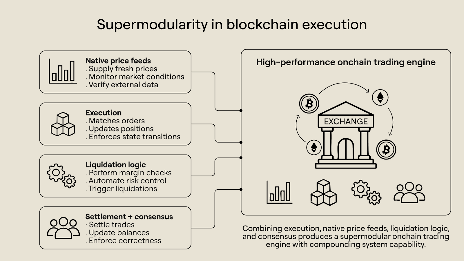 The previous example (Hyperliquid) revealed blockchain execution and price feeds (oracles) as supermodular components. A native price feed makes blockchain execution more valuable by enabling complex execution logic–particularly for financial applications–that depends on reliable, timely access to real-time prices, such as conditional orders, liquidations, margin checks, and circuit breakers. Blockchain execution also makes investing in native price feeds valuable because it creates sustained demand for high-quality pricing data and raises the value of investing in better oracle designs.