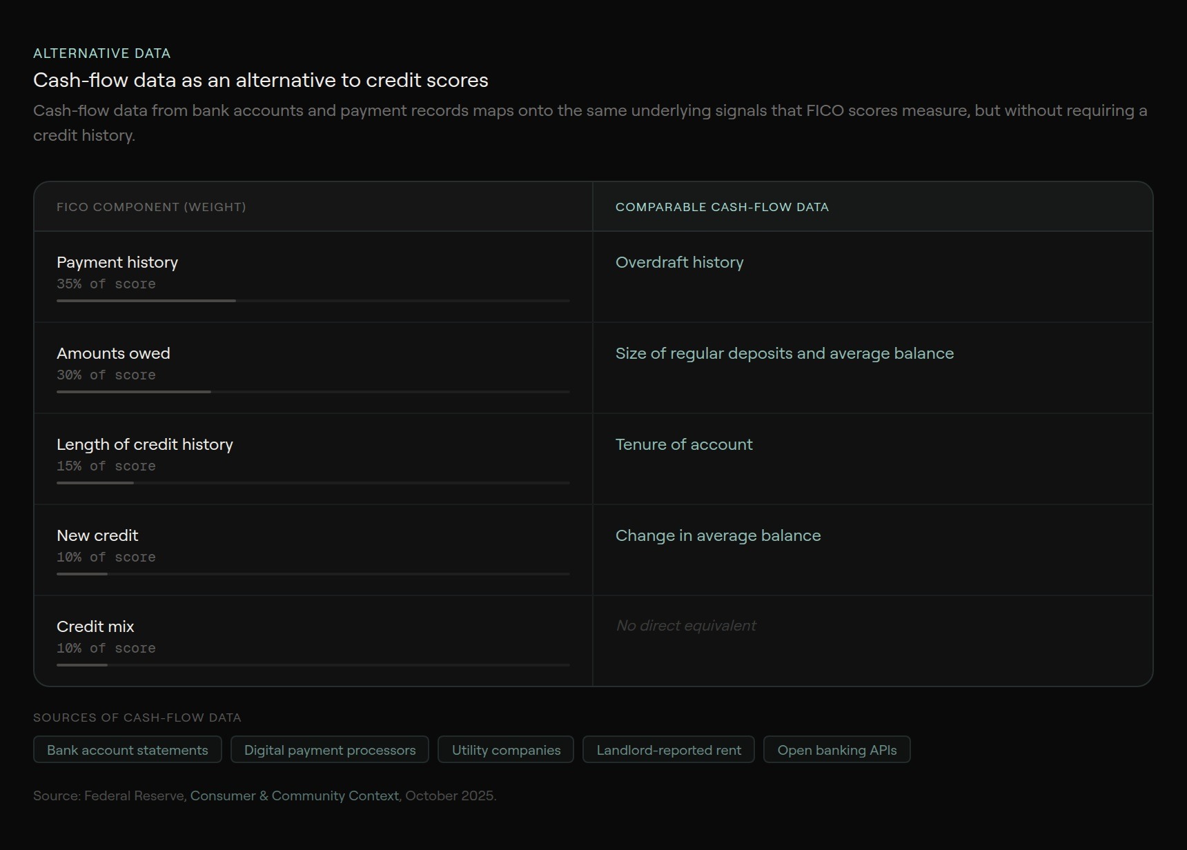 As awareness of FICO's limitations spreads, the consumer credit industry is beginning to look beyond the credit score. Lenders are incorporating alternative financial data (e.g., cash flow) and non-financial data (e.g., education and employment) into borrower assessments, rather than relying on credit scores alone. Research on fintech underwriting shows that lenders using alternative-data models were able to identify "invisible primes" (borrowers with low credit scores or thin files but statistically less likely to default), analyze risk more precisely, and improve their returns by approving loan applications that traditional lenders would incorrectly reject. The Federal Reserve has made a similar point from a policy perspective, suggesting that chartered institutions could use cash flow data to assess repayment capacity when underwriting small-dollar loans, rather than basing creditworthiness evaluations on bureau-reported scores.