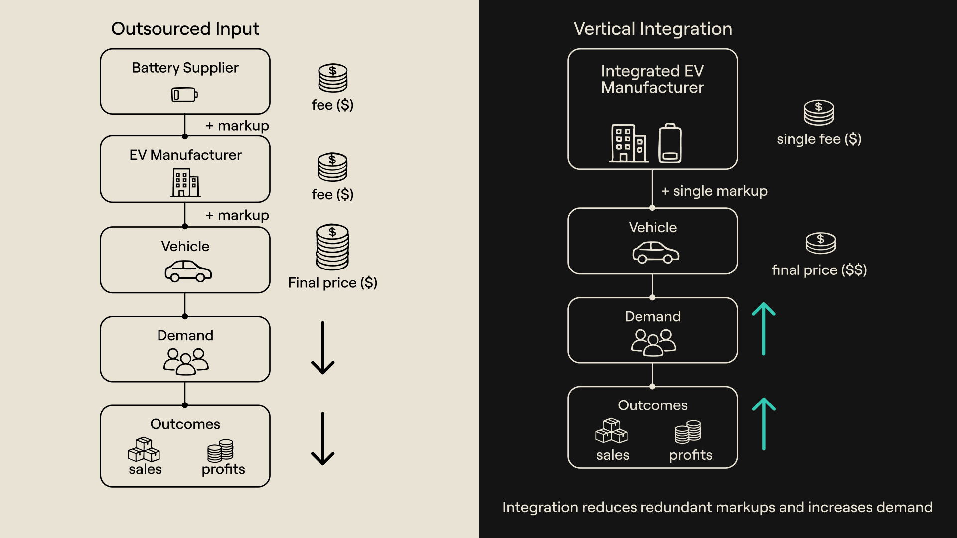 Integrating disparate functions inside a unified system is useful when those functions are complementary in production. Complementary functions reinforce each other's value (improving one raises the value of improving the other) and produce more value when composed together than they do in isolation. For example, an electric vehicle (EV) company that integrates vehicle manufacturing and battery production benefits from both functions reinforcing each other: improvements in battery design enable better cars, and better cars create more demand for better batteries. The combined system also produces cheaper inputs (sourced in-house rather than from external suppliers), higher quality outputs (car and battery designs can be co-optimized), and more value for both the manufacturer and the buyer than either function could generate independently.