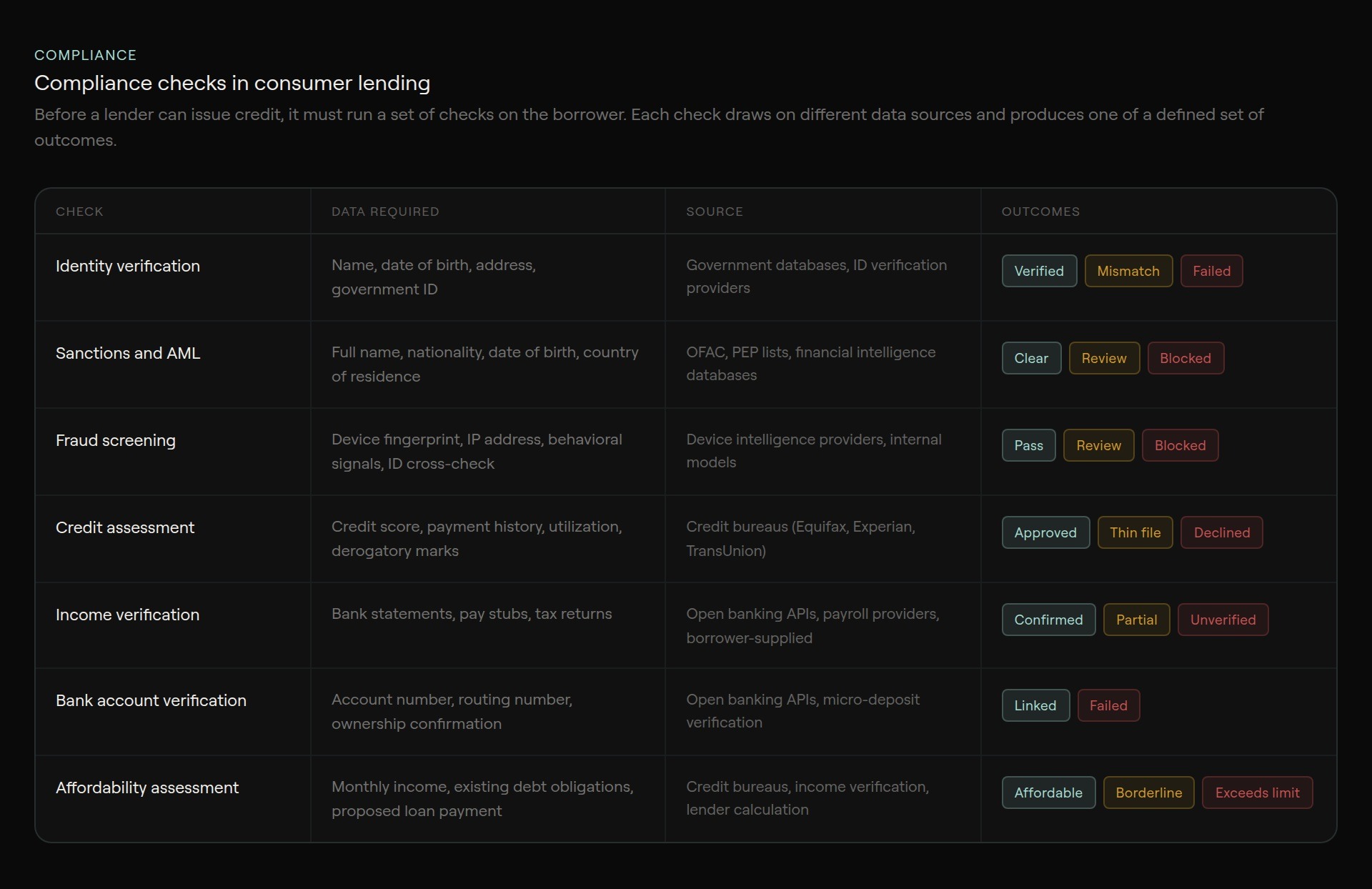 Before a lender can extend a line of credit, it must answer a basic question: should it lend to this person, and, if so, on what terms? Origination provides the answer to that question and covers identity verification, fraud screening, sanctions and compliance checks, creditworthiness assessment, policy evaluation, and offer generation. The output of origination is either a rejection of the loan application or a live, priced loan offer that the borrower can accept.