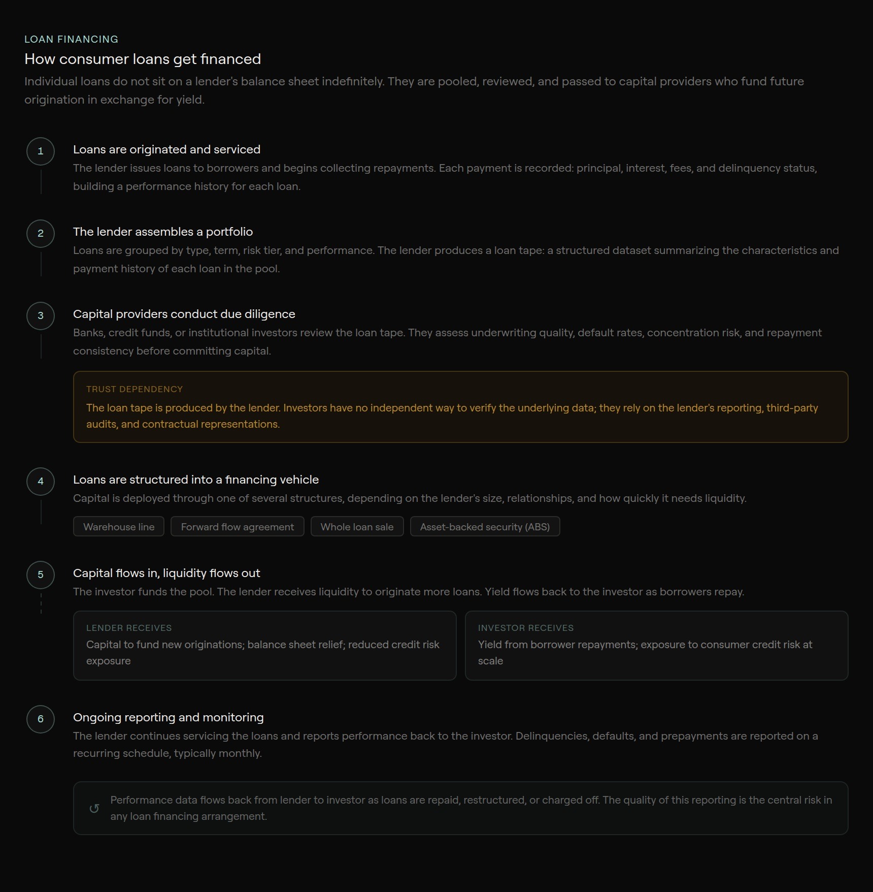 - Capital providers rely on the lending institution's reporting rather than directly inspecting the underlying assets when loans need to be financed or pooled.