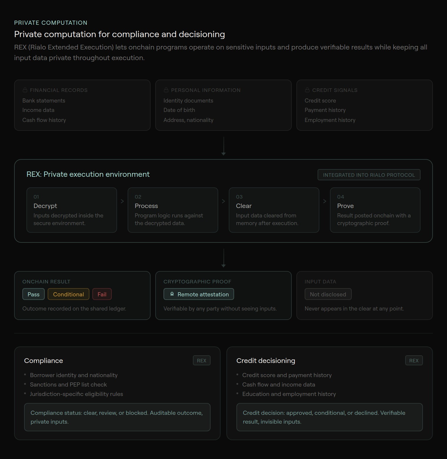 This is possible because sensitive inputs, such as a borrower's financial records and personal information, are encrypted before submission, decrypted within REX, processed according to the program's logic, and cleared from memory after execution completes. The result is then published onchain with a cryptographic proof that the computation was carried out correctly, without the underlying inputs ever appearing in the clear. What emerges is private and verifiable computation, which directly enables the kind of privacy-preserving compliance and decisioning that unsecured lending requires.