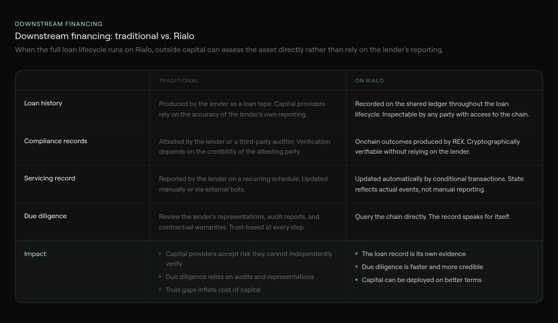 Downstream financing of consumer credit depends on the quality and legibility of the historical records associated with a loan. When origination, compliance, servicing, and enforcement all run on Rialo and produce state changes recorded on the same ledger, the full lifecycle of each loan is captured in a single coherent record. Because every state transition is written by deterministic protocol logic rather than manual processes, the record is consistent by construction: there is no gap between what the system recorded and what actually happened, and no institution has to vouch for its integrity.